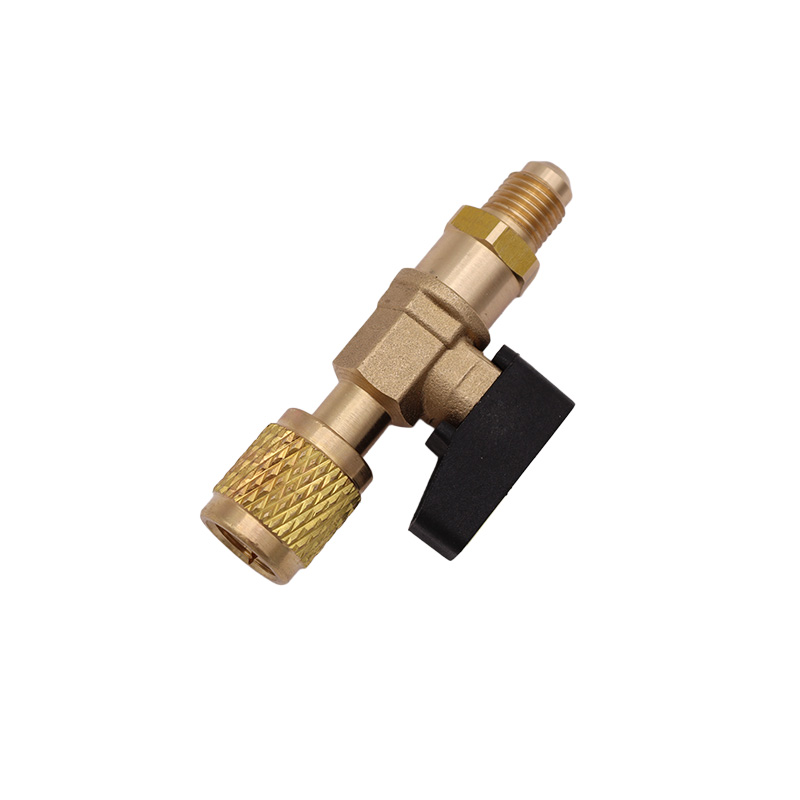 Rubinetto a sfera per gas refrigerante, dotato di raccordo girevole femmina e attacco maschio 1/4" SAE.